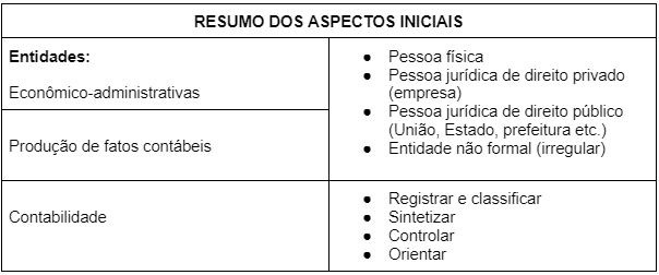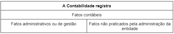As entidades econômico-administrativas produzem fatos contábeis passíveis de contabilização. A Contabilidade registra, classifica e sintetiza esses fatos, produzindo os relatórios financeiros (demonstrações contábeis), que permitirão a mensuração do Patrimônio e a determinação do resultado em determinado período.
